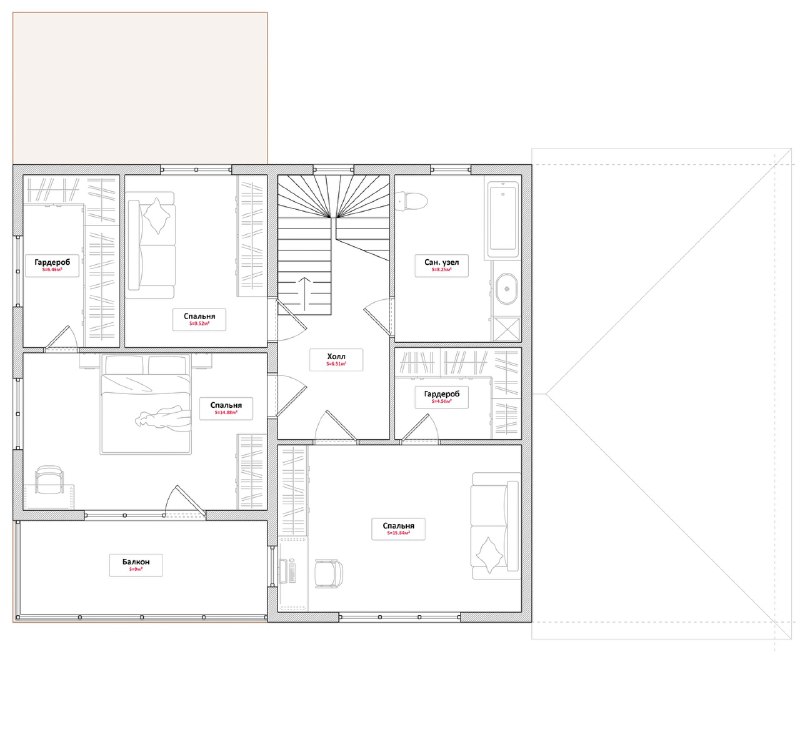 - Высота потолков: 1-й этаж — 3,4 м, 2-й этаж — 3,2 м, что создаёт ощущение простора и комфорта.