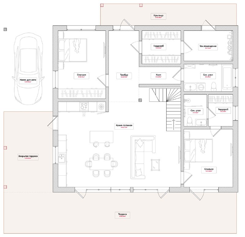 Из просторной гостиной зоны есть два выхода: один на большую террасу на южной стороне и второй - под навес для авто на западной стороне дома, что очень удобно в дождливую и снежную погоду.