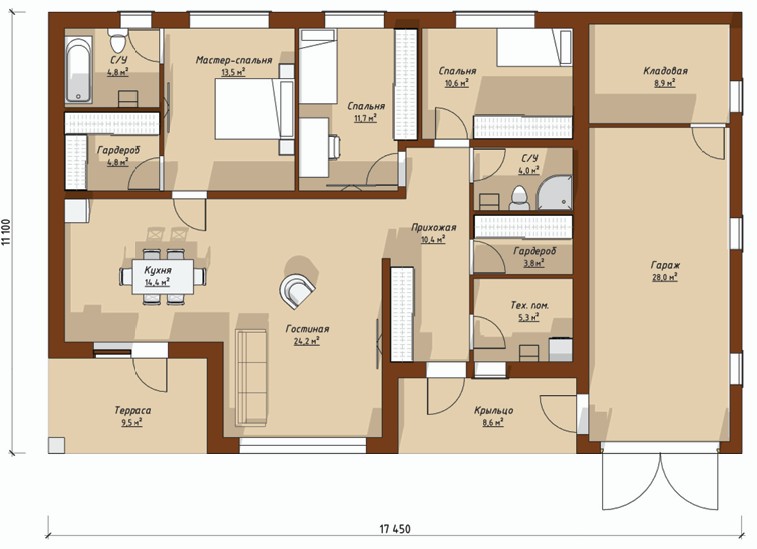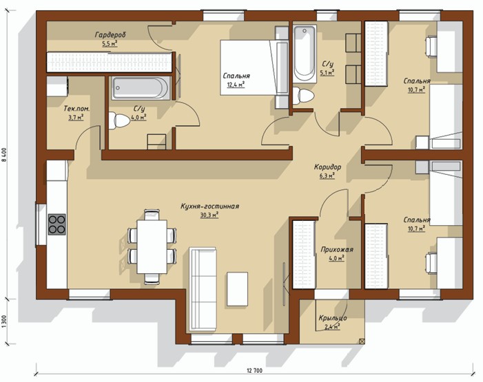 (фундамент - монолитная плита, стены - газоблок 300 мм, внутренние стены/ перегородки - газоблок 100, 200 мм., перекрытие - утепление и подшивка в конек, кровельный материал - металлочерепица)